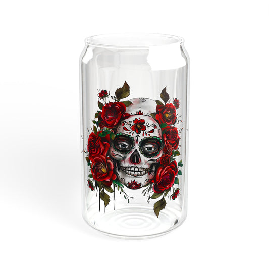 16oz Sugar Skull Glass Tumbler with Bamboo Lid and Straw – Day of the Dead Design